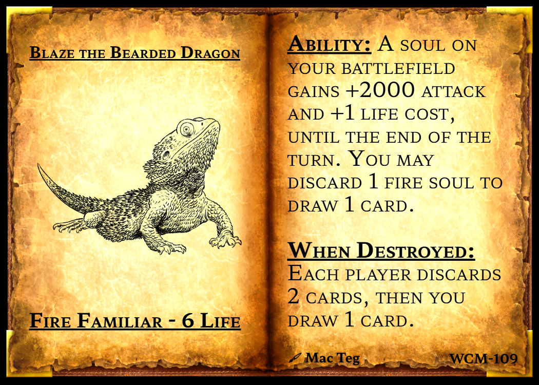 Ability: A soul on your battlefield gains +2000 attack and +1 life cost, until the end of the turn. You may discard 1 fire soul to draw 1 card.