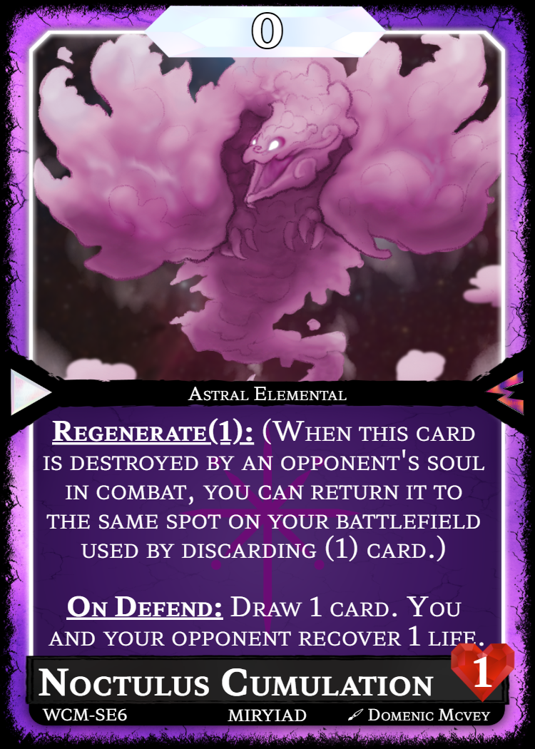 Regenerate(1): (When this card is destroyed by an opponent’s soul in combat, you can return it to the same spot on your battlefield used by discarding (1) card.)