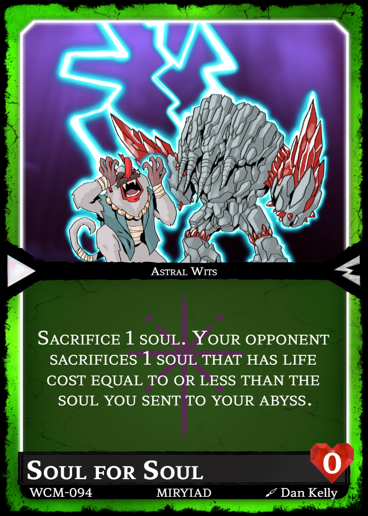 Sacrifice 1 soul. Your opponent sacrifices 1 soul that has life cost equal to or less than the soul you sent to your abyss.
